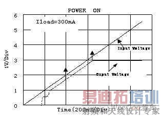 在测试压差(Dropout)时不同的厂家有不同的标准。德州仪器(TI)电压差定义为输出电压较其标称值跌落2%时的输入、输出电压的差值.其它的如,美信(Maxim),圣邦微电子(SGMC)电压差定义为输出电压较其标称值小于100mV时的输入、输出电压的差值. 如图为圣邦微电子的SGM2007负载为300mA时输入电压和输出电压的曲线。