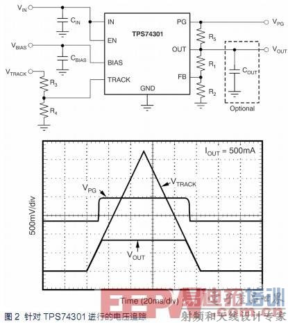 复杂数字系统需要的另一项功能是电压追踪,许多处理器在CORE和I/O电源引脚之间的静电放电架构往往有很大的压力,这项功能有助于降低这个压力。追踪功能使 LDO 输出电压能够追踪外部的电源(见图2)。 [p]