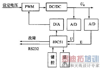控制系统通过I/O输入端口经D/A转换控制功率转换的开关的导通与关断时间,完成对输出电压的稳定,通过A/D转换完成对开关电源输出电压和电流的采样,通过系统软件实现了过压、过流保护及限流功能。同时采用双闭环控制系统,开关电源工作时,采用电压反馈由PWM控制实现对输出电压的稳压功能,控制闭环为电压环或电流环;在电池充电或过载时采用电流信号作为反馈,控制电池的充放电电流并实现过载保护的功能。为了精确控制开关电路的电压输出,把单片机的高频脉冲信号分频后变成适宜的开关脉冲信号,作为89C51的计数脉冲和门控信号。单片机把给定值与传感器采集的信号进行比较,产生误差信号。根据电压控制算法设置89C51产生不同占空比(0~90%)的方波信号,经过光电耦合器控制开关调整电路电压输出。输出端与开关电路进行光电隔离,从而避免了来自开关电源电路的骚扰信号对单片机系统正常工作的影响。