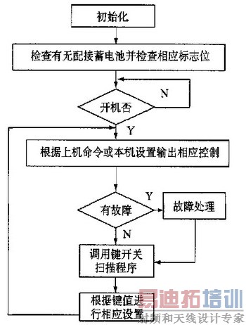 本软件主要完成对信号采样,各种数据处理、以及对功率转换部分的控制等。本系统软件主要包括键开关扫描程序、故障判别子程序、均充及浮充子程序、中断检测子程序和通信子程序等。主程序流程图如图4所示。