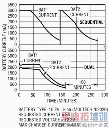 传统上,双电池系统是顺序放电系统,允许顺序消耗电池电量(先消耗电池1,再消耗电池2),以简单地延长总的电池工作时间。ltc1760采用了专有模拟控制技术,可允许安全地对两个电池并行充电或放电。图1是一个采用ltc1760的双电池系统的简化原理图。这种结构使充电速度提高了50%,电池工作时间延长了10%。此外,并行放电不仅增强了电流能力,而且还降低了i2r损耗并改善了在极高负载条件下的电压调节能力。降低i2r损耗和改善电压调节都延长了时序解决方案的总放电时间(见图2)。