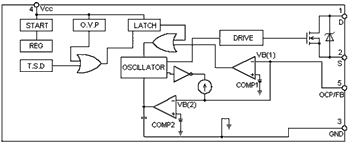 IRIS4015系列是一种专为准谐振工作方式的反激式变换器,其最大优点是将准谐振反激式变换器的控制电路和高压MOSFET集成在一个TO-220封装中,因此不需要另外设置开关管。IRIS4015系列的内部原理框图如图1所示。
