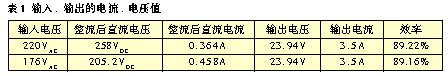 电源的效率是衡量电源性能的一个重要标准。开关电源具有效率高的优点,但通常情况下,反激式开关电源的效率都低于85%。输入电压不同时,开关电源的效率也不同。测试结果如表1。