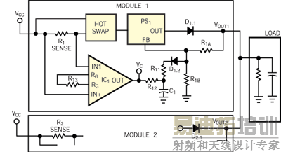 仪表放大器IC1测试并产生一个与输入稳压器的电流成正比的电压VC。VC又控制VOUT,从而使稳压器进入工作状态。对于大多数可调的控制器来说,VOUT=VREF(1+RA/RB),式中RA和RB在模块1中分别为R1A和R1B。如果没有电流流过RSENSE,则IC1的输出接近于地电位,使得R1B与D12、R11和R12三者的电阻并联,从而使RB更小,VOUT1更高,VOUT1的增高只需补偿配置相同的电源模块之间的VOUT变化。这种变化只有几个百分点。如果流入负载的电流增大,则VC也会增加,从而减少流过D12的电流,结果使VOUT1下降。当IC1的输出电压上升并与VFB之差小于D12两端的直接电压降,则D12中就没有电流流过。因此,对于任何较大的电流来说,VOUT都保持上述公式规定的数值。只要R3(仪表放大器的增益设定电阻器)选择得当,其他电源模块的R1和R2均利用所有电源为负载提供所需的电流,从而保证所有电源处于工作状态。