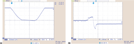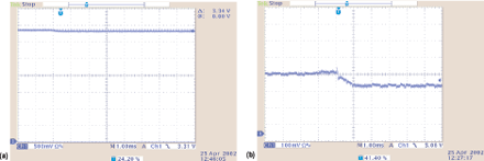 图2 当你从冗余配置中去掉一个电源时,就会引起输出电压的下降(a)和瞬时波动(b)。