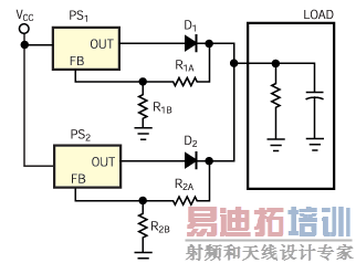 为了提高冗余度,不少使用"或"运算二极管的电源都可接入同一个负载。在维护期间,当你拆去任何一个电源时,希望负载的电源骚动尽可能最小。为了补偿"或"运算二极管两端的电压降,你必须在"或"运算二极管之后,在负载处连接电源反馈线。因此,所有参与电源的反馈连接是通用的(图1)。