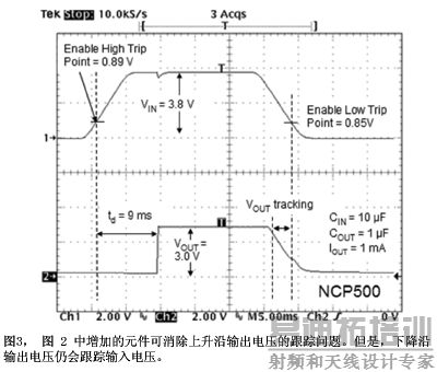 其中,VIN(TURN-ON)是用户定义的导通电压,VEN(RISING)是使能脚上升沿的断开点电压,而VEN(FALLING)是使能脚下降沿的断开点电压。例如,VIN(TURN-ON)=4V,VEN(RISING)=0.89V和VEN(FALLING)=0.85V。为避免稳压后的输出电压跟随输入电压,将VIN(TURN-ON)的最小值设为VOUT+VDROPOUT,其中VDROPOUT 是降压电压。