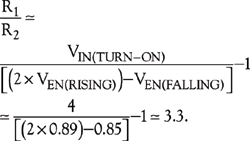 计算电阻器R1和R2值时可以用公式1,以改变图4中电路使能脚的阈值电压。