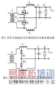 ③具有两种等效的电路拓扑结构可供变换选择。图1适合于共阳二极管接法,图2适合于共阴二极管接法;共阳二极管接法特别适合于 VDMOS的同步整流:将两个二极管替换为VDMOS,而它们正好是共源极连接,很适合用在高频主变压器上的辅助带中心抽头绕组来同步驱动,如图5所示;有可能通过三点式(耦合)电感方式引入前置小电感,抑制二极管较大的反向恢复电流,如图6所示。