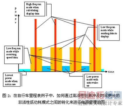 拥有任一此类时钟源,就可以随意地使用片上频率锁定环(FLL)使总线速度成倍地升高或降低,来满足任务需求并且使功耗达到最小化。图2为自行车里程表例子中不同操作模式下功耗的改变情况。
