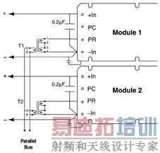 若数组内模块距离很远,或利用独立电源工作,可以采用变压器耦合变频模块来实现均流,见图3。由于均流的信号是高频率的脉冲信号,所以可用变压器耦合。变压器耦合的脉冲信号可以提供较强的共模噪声免扰性,同时与主电源隔离,保持电压在安全的低水平。这在需要机板对机板均分负载及备份的应用中特别有效。由于PR脉冲频宽很窄,一个细小、低电容值的变压器就足够了。