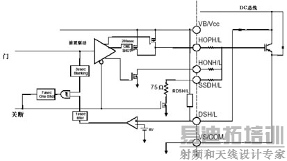 图4显示了带IGBT保护的一个HVIC三相门驱动的输出。在ON状态时,通过一个外部二极管感测IGBT收集器-发射器电压,可以探测到过流的发生。然后将Vce与一个8V的临界电压进行比较,作为结果的信号会被过滤 1μs。这里还采用一个3μs消隐滤波器(blanking filter),目的是移除IGBT开启时的末端电流。当探测到高端降饱和条件时,输出级立刻就进入高阻抗状态,SSD被激活,通过SSD的H/L针脚上的75Ω的内部阻抗就可关断IGBT。SSD驱动保持该状态7μs,使得IGBT可以平稳地放电,也可加一个外部电阻来进一步控制放电速率。
