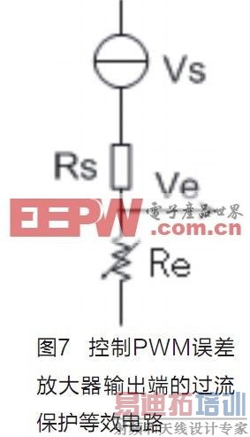 当DC-DC变换器工作于过流状态时,误差放大器工作在饱和区。由于误差放大器不是理想运放,因此输出电阻不为零,因此将其简化为一个含内阻的电压源。三极管 V2工作在线性放大区,可以将其简化为受控可变电阻(Re),因此图6可以简化为图7所示的原理图。当输出过流后,过流采样信号升高,导致Ib增大,使得 V2的Ic增大,由于误差放大器内阻的存在,使误差放大器的输出电压Ve降低,这样就使PWM的驱动信号变窄,使输出电压降低,限制了输入电流。