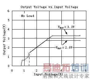由此得出低压差线性稳压器(LDO)的一个重要特性,在输入电压大于最小工作电压和输出电压其标称值范围内,负载电流为零时,输出电压随输入电压的变化而变化,这就是LDO的跟随特性,待输出电压达到其标称值后不随输入而变化,从而达到稳压的目的,这就是LDO的稳压特性。如图为圣邦微电子的SGM2007输入电压和输出电压的曲线。