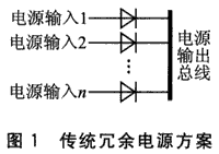 传统的冗余电源设计方案是由2个或多个电源通过分别连接二极管阳极,以“或门”的方式并联输出至电源总线上。如图1所示。可以让1个电源单独工作,也可以让多个电源同时工作。当其中1个电源出现故障时,由于二极管的单向导通特性,不会影响电源总线的输出。