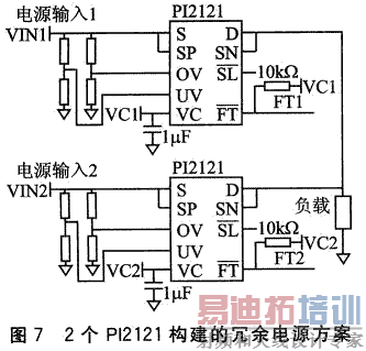 图7是由2个P12121芯片构成的带过压、欠压检测的双路冗余电源方案。P12121为Vicor(怀格)公司的一款电源冗余专用芯片,由于其内部集成有24 A、1.5 mΩ的MOSFET,因此外部电路非常简单。芯片OV为过压检测引脚,高于0.5 V时MOSFET自动切断;UV为欠压检测引脚,低于0.5 V时MOSFET切断,FT为状态输出引脚,VC为芯片工作电源引脚。使用P12121也可以灵活地构成多路输入电源方案。