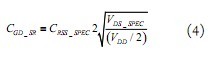 这里, CGS=CISS-CRSS是MOSFET的线性栅源电容,CGD_SR是低压非线性栅漏电容或“密勒”电容CGD=CRSS。后者的选择最好对应SR关断期间电压摆幅的中间值,VDD/2。这个值可从CRSS与电压的关系曲线(若提供)读取,也可以根据使用手册给出的对应某些更高电压VDS_SPEC的CRSS_SPEC值按照下式求出: