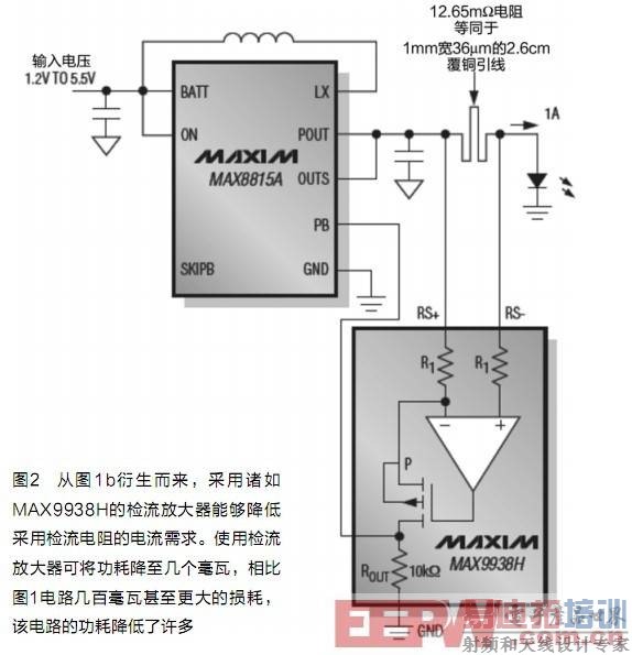 为了降低检流电阻的功耗,应采用低损耗电流检测电路,例如采用电阻/运放结合的方式提供开关转换器所要求的反馈电压。可以采用专用的精密检流放大器,例如MAX9938H,为检流电阻两端的电压产生100V/V的检测增益。这一方案能够把反馈电路的损耗降至几个毫瓦,甚至可以采用电路板上的一小段覆铜引线作为小的检流电阻,成本几乎为零,由此可见,该方案具有很大吸引力。