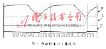 这种电源的另一个优点是当负载较轻时Uref自动下降,从而自动取消对充电贡献不大的下降沿处的充电,减少高频谐波。图7为负载较小时的工作波形。