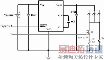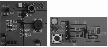 手机相机的低压闪光灯电路设计本着高效、低成本、占位面积小的原则来选择Flash LED的驱动IC。要求驱动IC能在低电压下输出150-300mA电流,周边使用的器件要少,这样可以有效地减少PCB板的面积;要将手机锂电池不稳定的低电压转换成稳定的4~5V和能输出150~300mA电流的Flash LED驱动工作源。就目前的IC来说,有两种可以考虑,一种借助于电感器的升压电路(见图1),另一种借助于电容器升压的电荷泵电路(见图2)。它们的实验PCB板如图3所示。为了演示方便,实验PCB板用按钮替代触发IC。选用电容器升压的电荷泵电路比较经济,PCB板上除了电荷泵和Flash LED两个IC外,只需要三个电容器、两个电阻器和一个0.5A电流的MOSFET,占用PCB板面积较小;选用电感器的升压电路,除了升压和Flash LED两个IC外,还需要一个电感器、一个肖特基二极管和数个电容器、电阻器。从手机的特殊应用来考虑,手机的LCD显示屏和相机镜头、闪光灯都位于手机的上方,与射频电路靠得很近,因此如何防止幅射和串扰十分重要。