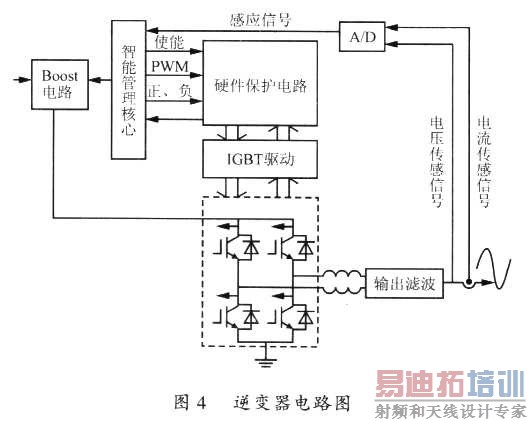 DC/DC变换由48V铅酸蓄电池输出通过Boost电路升压至360V,采用UC3825PWM控制芯片,其产牛PWM频率高,且造价低。DC/AC逆变器主电路由H桥式ICBT构成,还包括熔断器、抗干扰的滤波器、保护二极管等。控制电路由控制环节和保护环节两部分构成智能管理核心作为控制环节对主电路的输入电压、输出电压、输出频率和输出波形进行校正控制。保护环节分为硬件保护部分和软件保护部分,完成对系统的短路、过载、失压、过压、缺相等的保护。逆变后的单项交流电通过电压、电流传感器,把状态返回智能管理中心,以便对波形实行校正。逆变器的电路构成如图4所示。
