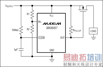 同种类型的电路可以用一个电压检测器和一个p沟道MOSFET实现,不需要第2个较高电压。但是,此电路不适合低压电源。另外,p沟道MOSFET较高的导通电阻,使其对大功率应用不合适。