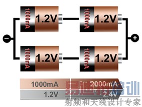 在电池组中是把多个电池串联起来,得到所需要的工作电压。如果所需要的是更高的容量和更大的电流,那就应该把电池并联起来。另外还有一些电池组,把串联和并联这两种方法结合起来。一个膝上型电脑的电池有可能是把四节3.6V锂离子电池串联起来,总电压达到14.4V;然后,再把两组串联在一起的电池并联起来,这样,电池组的总电量就可以从2000毫安时提高到4000毫安时。这种接法称作“四串两并”,它的意思是:把两组由四节电池串联在一起的电池组并联起来。