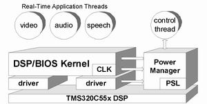 德州仪器(TI)的 DSP/BIOS操作系统增加了电源管理器模块(PWRM)作为辅助模块,如图1所示。电源管理器与 OS 内核联系松散,位于该内核的旁边;它不是作为系统中的另一项任务,而是作为一组 API 存在,在应用控制线程与器件驱动器环境下执行。