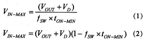 当输入输出压差较大时,要求电路以非常低的占空比运行。2.2 MHz开关频率下的低占空比意味着非常短的最小可控导通时间。MAX5072的最小可控导通时间(toN-MIN)约为100 ns。对于降压变换器和升压变换器,用公式(1)、(2)可分别计算出对于给定的输出电压,在没有发生跳脉冲的情况下所允许的最大输入电压(VIN-MAX)。