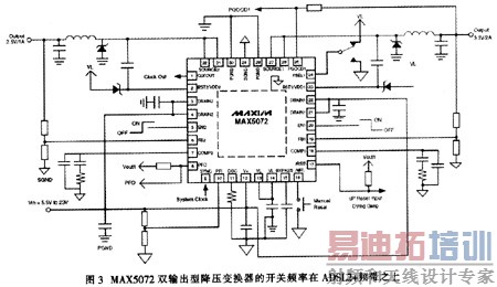 MAX5072的输入电压范围为4.5 V~5.5 V或5.5 V~23 V。用于为ADSL芯片组供电的电压包括1.2 V,1.8 V,2.5 V和3.3V,另外还有为线驱动器供电的5 V或12V电压。MAX5072的两个变换器都可以配置成降压或升压变换器。这使MAX5072能够用于各种可能的电压变换。当输入输出压差较大时,要求电路以非常低的占空比运行。2.2 MHz开关频率下的低占空比意味着非常短的最小可控导通时间。MAX5072的最小可控导通时间(tON—MINWj为lOOns。用下面的公式可计算出对于给定的输出-电压,在没有发生跳脉冲的情况下所允许的最大输人电压(VIN-MAX)。