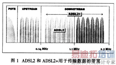过去几年来,ADSL标准沿着ADSL、ADSL2、ADSL2+以及“Extended Reach ADSL2”逐步演进.数据传输率增加到24Mb/s,传输距离长达22000英尺。 ADSL2标准规定的下行频段上至1.1MHz.而ADSL2+为2.2MHz,使较短电话线上的数据传输率显著提升。图l和图2给出了不同标准所覆盖的带宽、数据速率和距离。当同一线束中传输多条ADSL业务时,ADSl2+也可用于降低串扰。