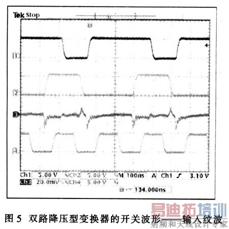图6为双降压型变换器的开关输出纹波波形.输出电容上的纹波频率为2.2MHz,与变换器的开关频率相同。CHl=SYNC,CH2=SOURCEl,CH3=输出1上的纹波,CH4=CLKOUT。