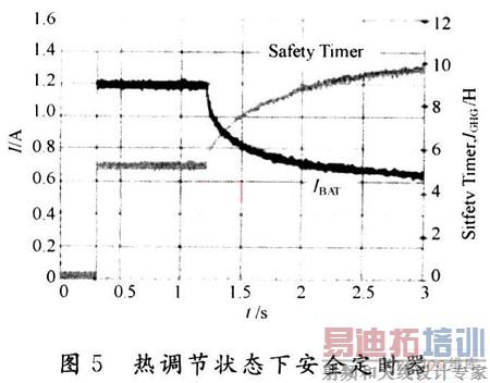 热调节通常在快充早期阶段进行,不过如果在CV模式下它仍然工作的话,充电电流就会过早达到充电终止阈值。为了避免错误充电终止,只要散热调节回路在工作,电池充电终止功能就会被禁用。此外,有效充电电流降低会延长电池充电时间。如果充电安全计时器有固定设置的话,就会过早终止充电。BQ24060采用动态安全计时器控制电路,能在热调节阶段有效延长安全时间,并尽可能降低安全计时器的故障几率。从图5中可以看出,热调节模式下的安全计时器的响应与有效充电电流成反比。