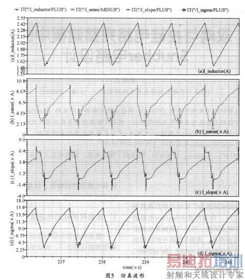图5所示是整体电路在典型情况下(D>50%),加入斜坡补偿的仿真波形。其中,图5(a)是电感实际的电流波形。其电感电流峰值为Iinductor_PEAK=1.796 A;图5(b)是采样得到的电感电流波形,其采样电感电流峰值为Isensc_PEAK=10.505μA。