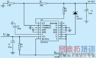 输出电压V-out=Vref(R2/R1+1)=1.25×(R2/R1+1),R1=2.2KΩ,R2根据输出需要计算其值的大小。图3中R4即为Rsc,为峰值电流检测电阻,Rsc的阻值越大,允许的峰值电流越小。如果要扩大电流可外接NPN或PNP型开关晶体管可使输出电流达到3.0A。Rsc最小值由公式给出:Rsc(min)=0.25/Ipk(switch)=0.25V/3.4A=0.0735Ω。