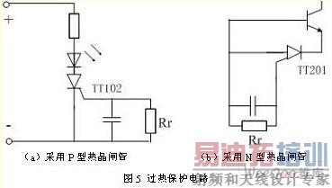 本文采用温度继电器来检测电源装置内部的温度,当电源装置内部产生过热时,温度继电器就动作,使整机告警电路处于告警状态,实现对电源的过热保护。如图5(a)所示,在保护电路中将P型控制栅热晶闸管放置在功率开关三极管附近,根据TT102的特性(由Rr值确定该器件的导通温度,Rr越大,导通温度越低),当功率管的管壳温度或者装置内部的温度超过允许值时,热晶闸管就导通,使发光二极管发亮告警。倘若配合光电耦合器,就可使整机告警电路动作,保护开关电源。该电路还可以设计成如图5(b)所示,用作功率晶体管的过热保护,晶体开关管的基极电流被N型控制栅热晶闸管TT201旁路,开关管截止,切断集电极电流,防止过热。