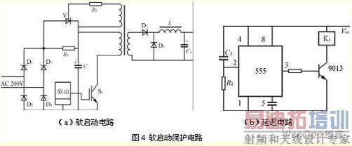 如图4(a)所示,在电源接通瞬间,输入电压经整流桥(D1~D4)和限流电阻R1对电容器C充电,限制浪涌电流。当电容器C充电到约80%额定电压时,逆变器正常工作。经主变压器辅助绕组产生晶闸管的触发信号,使晶闸管导通并短路限流电阻R1,开关电源处于正常运行状态。为了提高延迟时间的准确性及防止继电器动作抖动振荡,延迟电路可采用图4(b)所示电路替代RC延迟电路。