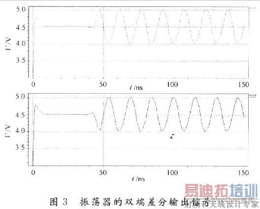 对整个系统在TANNER环境下利用Tspice工具和0.5/μm CMOS工艺库进行仿真。图3是2.5 V幅度控制电压和1.O V差动电压下差分振荡输出信号。仿真结果表明,起振时间仅52 ns,输出信号摆幅1.0 V,振荡频率66.25 MHz,功耗仅10 mW。