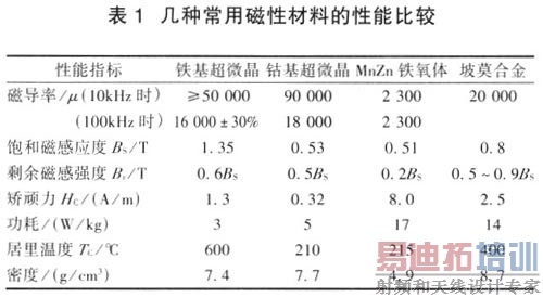 超微晶磁芯的型号很多,所传输的功率可从50 W到11kW。几种常用磁性材料的性能比较见表1。