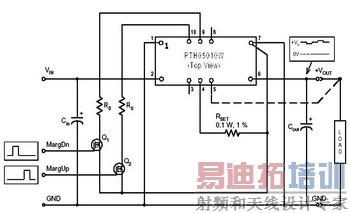 PTH03030模块的微调模块外部应用电路如图7所示。模块的微调输出电压正/负偏输出的控制脚分别是9和10脚,正偏微调电阻Ru通过场效应管Q2接地,负偏微调电阻Rd通过场效应管Q1接地。当需要输出进入正偏模式时,只要在Q2的栅极施加高电平,使Q2导通,Ru回路导通,通过内部的微调电压分压,可实现输出电压的正偏移输出,负偏电压微调输出同理。