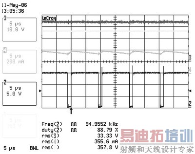 图 2 、图3 及表 2、表3 显示了这种电路在90 "265 VAC的通用输入电压范围内,以350 mA驱动两个有6个串联LUXEON FLOOD 25-0032 HB-LED板时的结果。表 2 显示了在输入电压范围内良好的电流调节。图 2 和图3 说明了正如理论所示的,由于占空比较小,输入电压较高时纹波较差。这表明在主电压较低的地区,如北美和日本,设备性能更加良好。然而,即使在最差的条件下,只要控制器输入电压保持在90 "265 VAC的范围内,仍可对电流进行适时调节。同时对只使用6个HB-LED板的系统进行了测量(见表 3) ,对比结果发现,±1.3%的调节差距导致负载电压的差距高达33.4V "16.4V。
