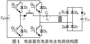 高压电容器充电电源的主电路拓扑如图1 所示,变压器变比为n,L 为谐振电感,C1 为谐振电容,TS 为开关周期,T1 为谐振周期,fS 为开关频率,TS>2T1,开关管工作在软开关状态。在所有串联谐振CCPS 中,设Co、Vco 分别为充电电容和充电电压,均有n2Co>>C1 成立。