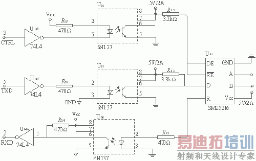 整个系统内部通过RS485进行通信。具体电路如图4所示。因为控制芯片都采用AT89C52,作为主监控单元CPU只有一个串口,而其并口也没有充分利用起来,故通过可编程串行接口芯片8250扩展串口,用并口来模拟串口。