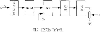 如图2所示,假定住ROM里已存贮了上述波形信息。波形计数器依次送山ROM里的地址信息0~359。在地址信号作用下,依次取出存入ROM里的各点幅伉数据,并送入D/A。在D/A中把幅值的数字信息变为相应的模拟电流,经运算放大器将电流信号变为电压信号,再通过低通滤波器滤除高次谐波,便可得到光滑的正弦波。