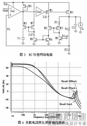 从第一个极点Po的表达式可得出,该极点与负载电流成正比,如果内部RC网络产生的零点频率固定不变,则单位增益带宽随着负载电流变化,同时可能会引起振荡,达不到补偿的效果。