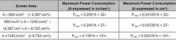 表2:根据ENERGY STAR V3.0标准计算各尺寸LCD TV最大允许功耗。
