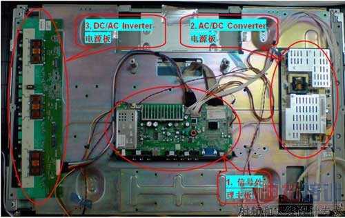 图2以传统32 LCD TV为例,其内部主要包括3块PCB板,即:1. 讯号处理主板,用于音讯视讯处理及系统控制等功能;2. AC/DC电源板,将市电的220V@50Hz或110V@60Hz交流输入转换成音讯系统、视讯系统、控制系统等所需要的24V/18V/12V/5V/3.3V等直流电压,并实现功率因子校正、与输入电网安全隔离等功能;3. DC/AC电源板,用于将AC/DC电源板输出的24V或12V直流电压再逆变升压得到1,000V@50KHz的交流电压,以此高压高频正弦交流电压来驱动背光CCFL灯管,并实现背光亮度调节等功能。