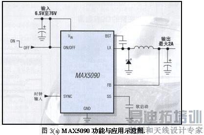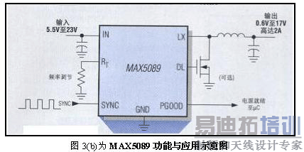 图3(a) MAX5090功能与应用示意图。其特征为:无需使用MOV或TVS;6.5V至76V宽输入电压范围;承受高达80V汽车甩负载;高性能,满载下具有92%的高效率,无负载时310μA低静态电流,19μA低关断电流;为严酷的汽车环境而设计,确保工作在-40℃至+125℃结温范围内,打嗝模式短路保护,保持器件凉态,热关断和短路限流。上述功能可整合在5mm X 5mmTQFN封装内。3.2频率最高并具有宽输入电压范围(5V至23V)的2A DC-DC转换器MAX5089见图3(b)示意。 其特征为:2.2MHz开关频率,避免噪声干扰 敏感的AM波段或ADSL2+频段;5V±10%或5.5V至23V的宽Vin范围,适合宽广的汽车电压范围和对xDSL和机顶盒的宽电压范围墙上适配器进行稳压及用于控制7V至14V的粗调中间总线电压非常理想;高效,同步整流驱动器允许在宽Vin范围内实现最高效率。 图3(b)为MAX5089功能与应用示意图。