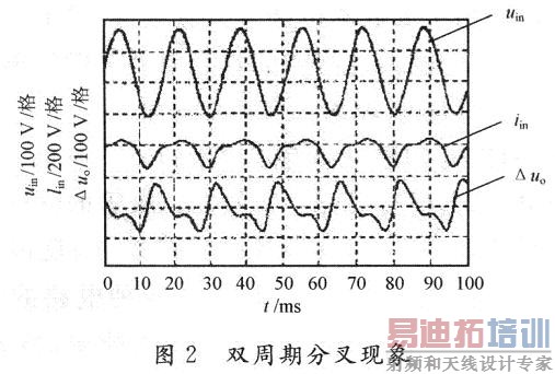 这种技术的电压环带宽控制在20 Hz以下,电流环则要求足够快以满足不失真和低谐波的要求。事实是,在实际产品的设计过程中,经由理论分析设计的电路在带阻性负载或者交流变频压缩机测试时,工作一切正常。但当带直流变频压缩机这类感性负载工作时,就出现新的不稳定现象见图2,即遇到双周期分叉现象。