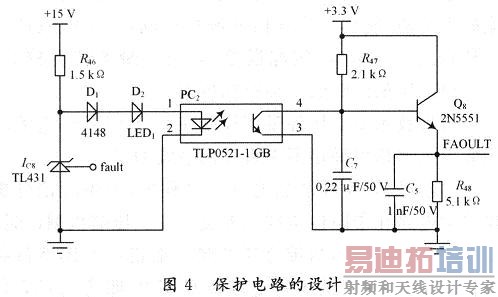 图4中fault为通过电阻分压后的待测电压。该设计巧妙地利用了低成本可调分流基准源TL431的基准电压特性,和外围元件组成的具有温度补偿门限的单电源比较器。具体原理为:在参考端加上一个可变电压后,会在阴极与阳极之间输出高+15 V或低+2.5 V电平的电压,再通过发光二极管与二极管的降压作用到光耦等器件上,在FAULT输出高低电平,反馈回主控制器,从而起到故障检测的作用。这种电路的优点在于,电路成本低,且简单可靠。在试验中,性能表现良好。